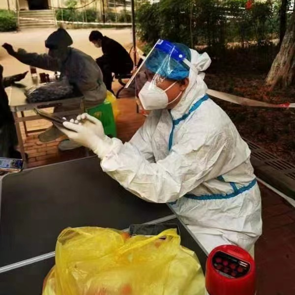 在做志愿者采集信息的当天,为了照顾上网课同学的时间,谭娅将原计划10:00开始的检测工作提前到8:00开始,因为穿了防护服一上午不能喝水不能上厕所,后背也全被汗水浸湿了,并且配合医务人员完成了859名住户核酸检测工作。