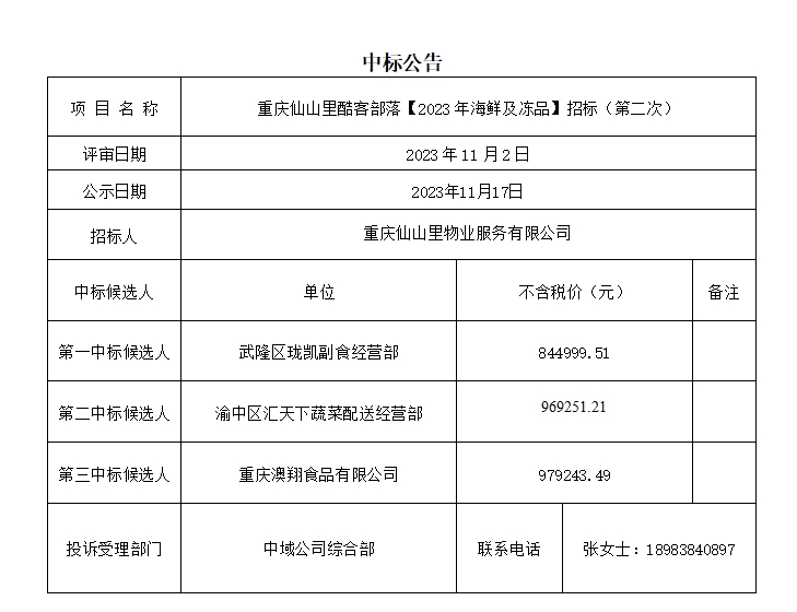 重庆仙山里酷客部落2023年海鲜及冻品(第二次)中标公告