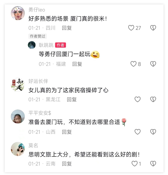2023年至今,微短剧持续爆火。今年年初,抖音账号“耿跳跳”发布的《我在思明》系列剧集,将“打工人奇遇”与厦门本地的文旅元素相融合,10集短剧播放量超过1192万,平均每集点赞量超过1.6万。在评论区,更是有不少观众被剧中场景安利,表示要到厦门旅游。